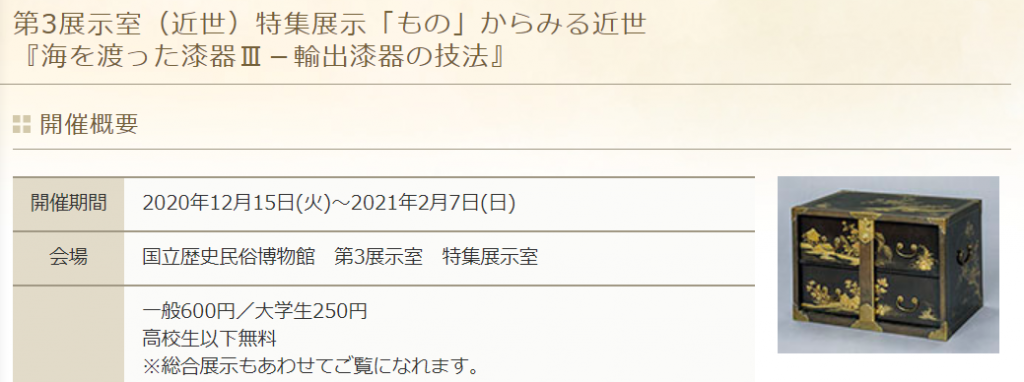名称:特集展示「もの」からみる近世「海を渡った漆器Ⅲ-輸出漆器の技法」国立歴史民俗博物館