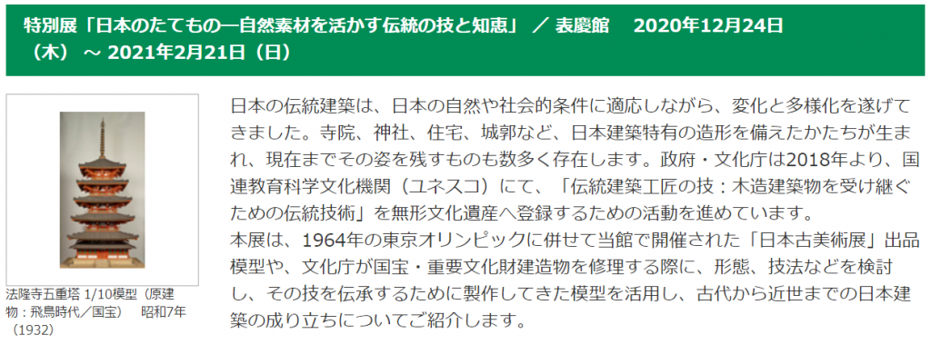 名称:特別展「日本のたてもの―自然素材を活かす伝統の技と知恵」東京国立博物館