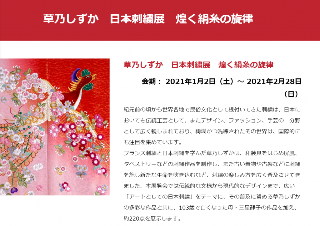 名称:「草乃しずか 日本刺繍展 煌く絹糸の旋律」奥田元宋・小由女美術館