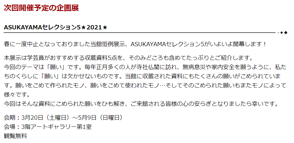 春に一度中止となっておりました当館恒例展示、ASUKAYAMAセレクション5がいよいよ開幕します!