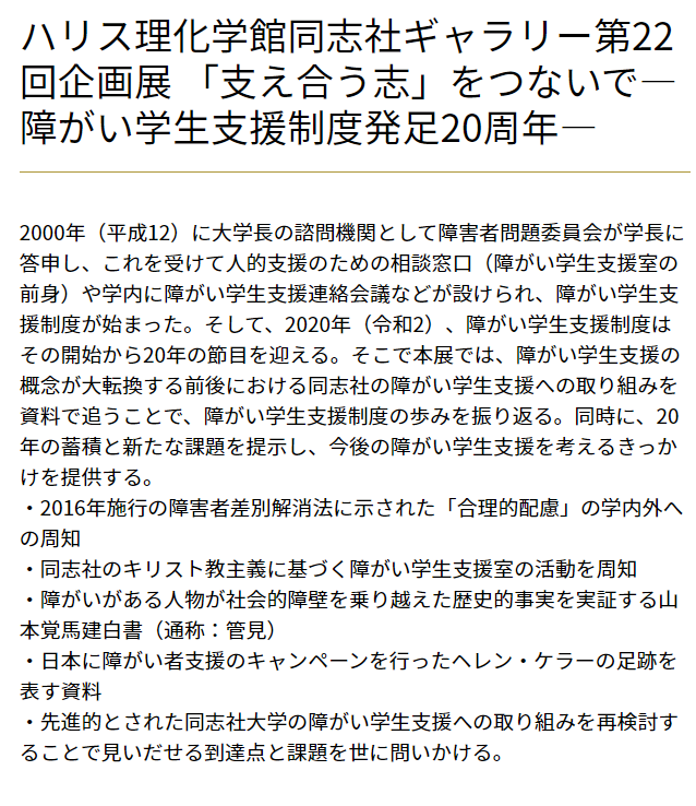 支え合う志」をつないで—障がい学生支援制度発足20周年—」ハリス理化学館同志社ギャラリー