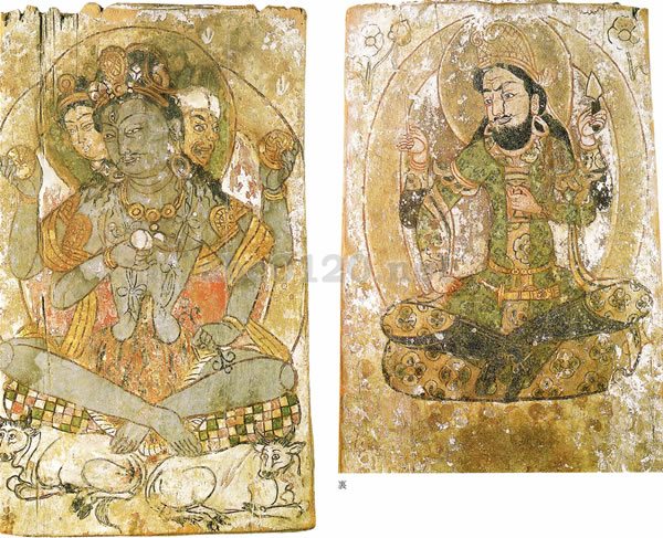 ダンダン・ウィリクは,中国新疆ウイグル自治区,タリム盆地街道のオアシスであるホータン(于闐)の東北方にある仏教遺跡である。本板絵は,スタインが第一回の調査(1900~01)の折に第7号址から発見したものである。片面に三面四臂のシヴァ神,他の面にイラン風の衣服を着た四臂の人物が描かれている。シヴァ神は,天王,夜叉,天女の三つの顔を備え,四臂にそれぞれ日,月,宝珠,三股杵を執って,二牛の上に坐る。イランの貴人風の人物は,四臂に杯や機織の筬,梭などを持ち,花模様のクッションの上に坐っている。その姿は,第10号址発見の養蚕西漸伝説を描いた板絵,ペトロフスき-が同遺跡から発見し,現在エルミタージュ美術館に収蔵される板絵などに登場する四臂像とほぼ一致しており,絹または機織の守護神と考えられる。両面とも抑揚のない強い描線で描かれ,肉身にほとんど隈がみられないのが特徴である。 出所:大英博物館所蔵日本・中国美術名品展