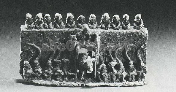 浮彫り風の装飾品。裏側に長方形のフックがついている。表側には高い台があり,中央に門がある。その門の上にうずくまった人物がかんぬきをひっぱって門を開けている。門はすでにあけ放たれ,大きな角牛が門内からのっしのっしと出ていこうとしている。台の上には11人の男女がいりまじっている。馬蹄銀形のまげを頭頂に結いあげた者が4人でこれは男子,まげを背中に垂らした者が7人でこれが女子である。みな坐って膝をかかえ,瞳をこらして牛に注目している。台の下の門の両側Jに5人ずつおり,みな高いさいづち形のまげを結い,頭に1本の長い羽根をさしている。膝をかかえて坐り,みな男子である。彼らは横を向いて,出てくる牛をみている。その姿勢は各々異なっている。門をあけるのを手伝っている者,頭をなでている者,いらいらした様子を見せている者,膝をかかえてみつめている者。その造型は躍動感にあふれている。この場面は,闘牛を見物している情景のようである。