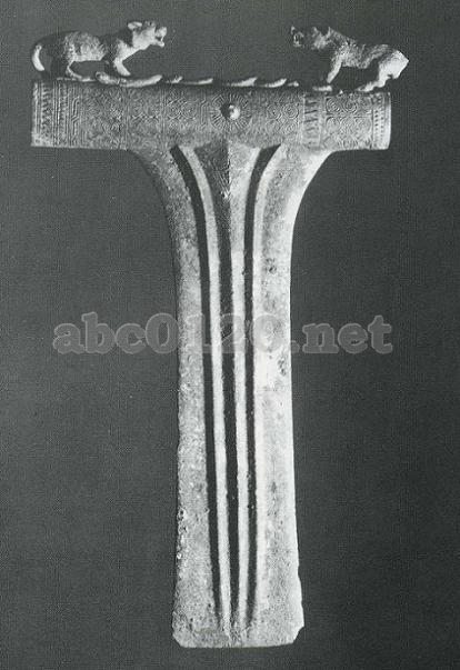 ソケット部には,太陽文,S字形雲文,鋸歯文が鋳出されている。ソケットの背には虎と猪がのっている。両者は牙をむきだして向いあっており,生き生きとしたそのさまは,これから展開されようとしている一場の残酷な格闘を暗示している。2匹の足下には,頭と尾をそれぞれ逆に向けた2匹の蛇がからみあっている。蛇はどちらも鎌首をもたげて,それぞれ猪と虎を注視し,すきあらば襲いかかろうとしている。このような文様が華美で装飾が施こされている武器は,戦闘の実用武器ではなく,滇王族の儀仗部隊が使用していた儀式用の装飾的武器とすべきであろう。出所:「雲南博物館青銅器展」