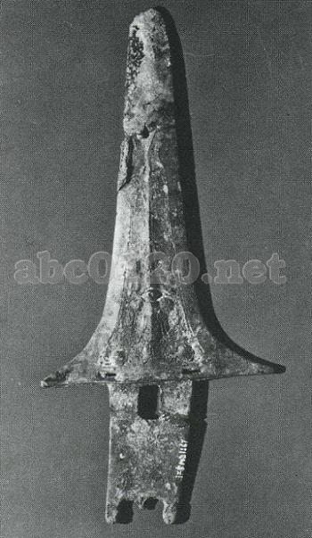 武器。援はまっすぐで胡はなく,内は長方形である。援に,変形した饕餮文,S字形雲文が地の文様として鋳出されている。頂端には雲文が鋳出されている。饕餮文は獣面文とも言い,古代伝説に登場する貧欲な兇獣の顔面を象徴化した文様で,人に恐怖と神秘の感覚を抱かせる。これは中国の殷(商)周時代の青銅器の主要な装飾文様である。雲南青銅器の装飾には饕餮文は多くはなく,わずかに数例あるのみである。ただしそれだけでも,中原文化と滇文化の交流と影響を反映している。出所:「雲南博物館青銅器展」
