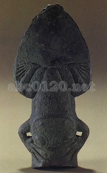 儀式用武器。刃の部分は幅広い。ソケットの部分と刃の後部が蛙の形を成している。蛙は大きく口をあけ,自然にソケットの開口部を形成している。曲がった前肢とソケット部との間にすき間ができ,前肢はあたかも双耳を成しているかのようである。蛙の背は,連続雲文,円圏文,鋸歯文で装飾されている。この矛は青蛙の姿形を如実に描写している。また蛙の各器官を巧妙にとらえて,それを矛の各部分にあてはめて結びつけている。一風変わった趣向の装飾図案は,見る人に深い印象を与える。これは得がたい芸術の珍品である。出所:「雲南博物館青銅器展」