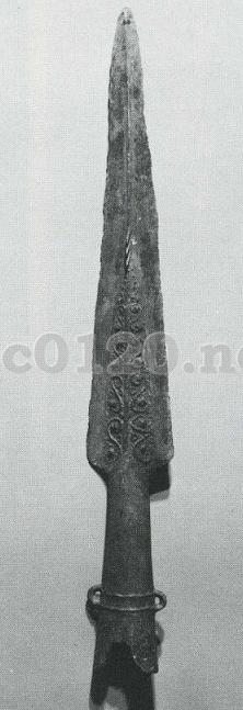 儀式用武器。この矛は形が巨大で,刃の脊上には3つの逆方向にとがった鋭利なとげがついている。刃の後部にはS字形文が鋳出され,ソケット部には隆起線文が2本走っており,ソケットの開口部は楕円形である。出所:「雲南博物館青銅器展」