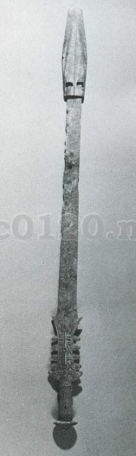 武器。柄は断面が楕円形で中空であり,上部は円点文で装飾されている。つばは縦に長く,その下端は三又に分かれている。つばの両側にはそれぞれ3つの円形の突起がある。またつばには円点文と円圏文が鋳出されている。この種の剣は前漢時代になってはじめて見られるものをある。晋寧県石寨山からも出土しており,金製の鞘を伴うことが多い。これは,当時の最も進歩した貴重な武器とみなすべきである。これは,現在の四川省西部と滇池,洱海地域(雲南西部)に広く分布しており,古代の「西南夷」が普遍的に使用していたものである。出所:「雲南博物館青銅器展」