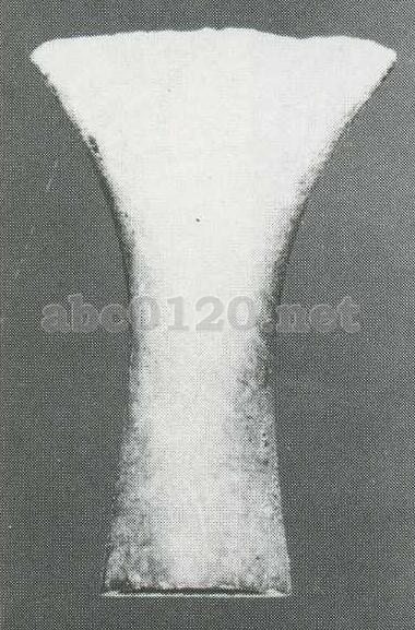 春秋晩期 青銅 長13cm 重312g 1972年江川県李家山出土 雲南省博物館所蔵 武器。ソケットは半円形。刃は幅広い。ソケット部に雷文,鋸歯文,点文と,身体が蛙で尾の長い怪獣が刻まれている。出所:「雲南博物館青銅器展」