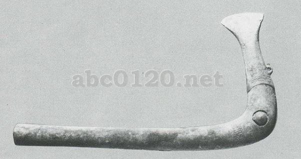 儀式用武器。まずソケットが楕円形で,刃部が弓形の斧を鋳造し,それに湾曲した青銅製の柄をとりつけたもの。斧のソケット部は,雷文と縄文で装飾され,柄の湾出したところには,円形のボタン形の文様とジグザグ文がある。この種の斧を通して,その他の斧を柄に装着する方法もはっきりと理解することができる。出所:「雲南博物館青銅器展」