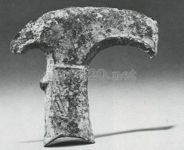 武器。全体は靴の形に似ている。ソケットは楕円形で,羽文が鋳出されている。靴形鉞は,滇文化にはあまり多く見られるものではなく,ベトナムのドンソン文化に典型的なものである。これは,両地域の文化の相互交流を反映している。出所:「雲南博物館青銅器展」