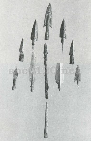 武器。茎(なかご)が中空で柳葉形のもの,茎が中空で両翼形のもの,茎が中空で菱形のもの,茎が中空で断片が三角形のもの,茎が中空で円筒形のもの等の種類がある。そのうち3点は,茎が鉄製である。出所:「雲南博物館青銅器展」