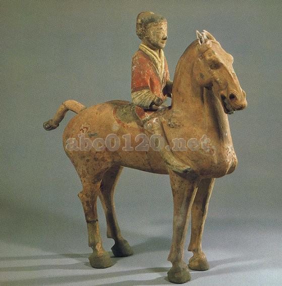 馬の姿はじずかに立つものや首をもたげていななくさまのものがある。毛並は黒,紅,紫の3種で,みな加彩の下鞍と面繋(おもがい)がある。馬は4足で直立している。馬にまたがる武士は,頭に頭巾をかぶり,身には紅または白のひざまでの短い戦衣をまとうが,そのうちの1点は黒い鎧をつけ,片手に手綱をもち,片手に武器を持つ姿をしている。出所:「シルクロード文物展」