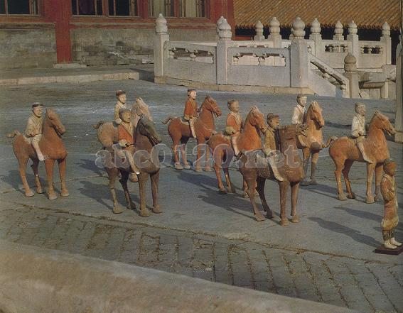 これらの加彩兵馬陶俑を見ると,前漢の文景時期には,騎兵が軍隊組織のなかで重要な位置を占めていたことがわかるであろう。同時にそれはまた,その当時の社会の経済が回復し,発展をとげたために,馬を飼育する事業の興隆を促し,その結果「庶民のちまたには馬がつながれ,田のあぜ道には馬が群をなしている」という情景を反映したものである。出所:「シルクロード文物展」