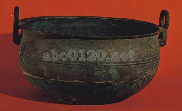 この鑑は初元3年(紀元前46年),東郡(郡治は現在の河南省濮陽県内)から上林苑の宮廷で使用するために調達されたもの。その容量「五石」,「重さ九十斤」,および番号「第六百六十」。出所:「シルクロード文物展」