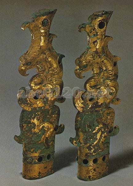 1956年から前漢の都長安の調査をすすめ,前後して城壁,城門,武器庫などの遺址の発掘をおこない,また,城内の長楽宮,未央宮、城外の建章宮などの宮殿の遺址の調査をおこなった。その結果,城の周囲が25キロメートルにも達することや城内区域の配置などの情況もはっきりわかるようになった。城内には宮殿区域,貴族の住宅区や集中的商業区があった。また,城外には大規模な手工業区域があって,皇室や官庁のために使ういろいろな日常生活用品をつくっていた。琉瑠鑲嵌の金銅鳥形飾端金具2個,大型銅鏡2面,鍍金銀臥虎銅鎮2個はいずれも長安城の附近から出土したものである。出所:「シルクロード文物展」