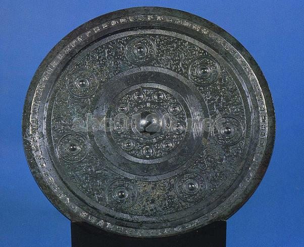 円鈕。鈕座には九乳文,その外側にやや大きな乳文が7つ,そのあいだに羽衣の仙人2人と四神(青竜・白虎・朱雀・玄武)および飛禽走獣などが配されている。線は流麗でよどみがない。鏡縁には文様がなく,74文字からなる篆書の銘文がある。これは比較的早期の七言詩で,その内容の大意は,「質の良い銅をつかってこの鏡をつくる。そしてこの鏡を用いて姿をうつせば, 1万年も長生きできるので仙人よりもすばらしい」。これは前漢時期における支配階級が長生不老を追求した迷信の思想を反映したものである。出所:「シルクロード文物展」