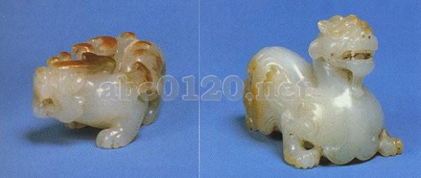 紀元前206~後24年 軟玉 高2.5cm 長5.8cm,高5.4cm 長7cm 1966年咸陽新庄出土 咸陽市博物館蔵 口をひらき牙をむきだしており,体の両側にいずれも羽翼をつけている。一頭はくびをもたげてうずくまっており,他の一頭は歩く姿をしている。出所:「シルクロード文物展」