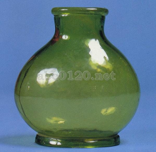 ガラス 高16.3cm 口径4.8~3.7cm 1957年西安隋李静訓墓出土 中国歴史博物館蔵 緑色で透明,口は格楕円形。直頸,扁形鼓腹。低い圏台がつく。出所:「シルクロード文物展」