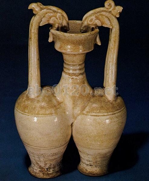 盤口,細頸,双胴の瓶で平底。腹上部からのびて口縁と連なる双竜のとってがあり,頸部と腹部には弦文がほどこされている。白釉はわずかに黄味を帯びている。下部は露胎である。出所:「シルクロード文物展」
