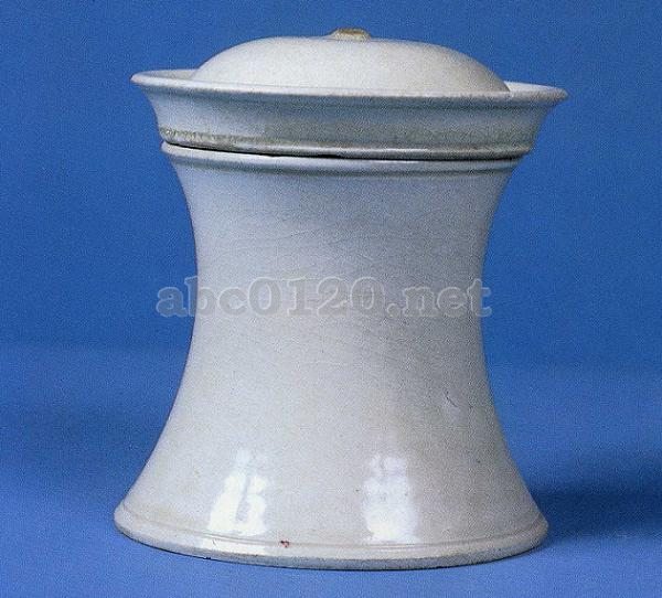 円形,口は大きく,腰部はしまり,平底。蓋のまわりと口のうえとが平らで,頂上は宝珠の鈕があったが,すでに欠けている。器の内外には白釉がほどこされ,やや黄味を帯びている。釉は厚く氷裂文があり,その光沢は目を奪うばかりである。出所:「シルクロード文物展」