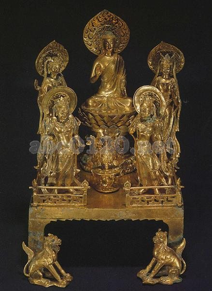 合計23点からなる。阿弥陀仏は蓮座のうえに坐し,後には蓮弁文の光背がつく。両側にはそれぞれ一体の苦薩と天王が侍立する。天王は前,菩薩は後で,それぞれ光背がつく。蓮座の前には香炉がある。群像は欄干のついた高足床のうえに配置される。床前には一対の獅子がうずくまり守護にあたる。床の右側と後側には銘文が刻まれ,開皇4年(584年)に董欽が造ったこと,発願文、讚辞などが記載されている。この像の彫鋳は精緻で,全体に鍍金がほどこされている。出所:「シルクロード文物展」