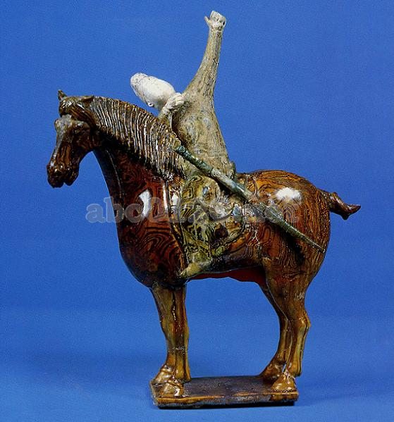 馬はすっくと直立し,足は方形の底板を踏む。頸部には長いたてがみが垂れさがる。馬身は褐色の模様の上に黄色釉がかけられている。狩猟者は頭に幞頭(ずきん)をかぶり,円領筒袖の長衣を身にまとう。全身は褐色の模様の上に緑袖をほどこしている。腰に長剣と,矢袋をさげていて,首をまわして上を向き空に向って弓を引いている姿勢である。出所:「シルクロード文物展」