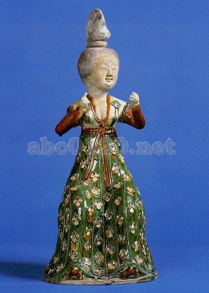 女子俑は墩(こしかけ)にすわる。頭には高いまげを結い,上半身には白地に緑色の花模様の短衣と褐色の筒袖の襦衫をき,下半身は緑色の地に白い花模様の裙をつけ,腰には褐色の長い帯をつけ,裙の下には雲形の靴先がのぞいている。左手は鏡をもち(鏡はすでに失われている),右手の食指ではほべにをつけるさまをしている。出所:「シルクロード文物展」