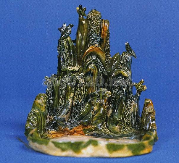 三彩の山池は,三彩の家屋と庭院と同時に出土したものである。従来発見されている中国園林建築の模型のなかでも最も古いもので,中国建築史研究上重要な資料となっている。山峰と水池があいつらなり,峰々が林立し,峰の上には樹木や草花や小鳥などがいる。山には藍緑,赭黄,草緑色の釉がかかり,池の真中は素地がでて,池辺には一対の小鳥が水を飲んでいる。出所:「シルクロード文物展」