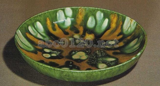 618~907年 陶・三彩 高2.7cm 口径15cm 1962年乾県唐永泰公主墓出土 陝西省博物館蔵 平底。盤内には黄,緑,白の三色釉,外側には緑色釉がほどこされており,色沢はあぎやかで調和がとれている。出所:「シルクロード文物展」