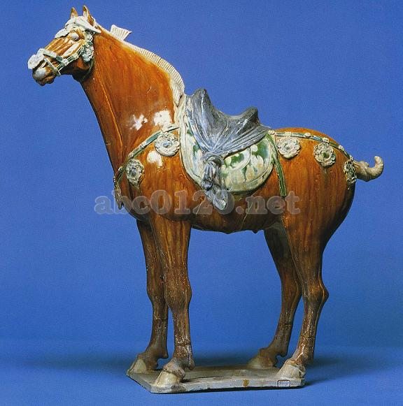 馬体は黄褐色,首をもたげで直立し,脚は方形の底板を踏むが,その底板のなかはきりぬかれている。頭には杏葉形の垂飾をさげた緑色のおもがいをかけている。背には緑と藍色の鞍と下鞍がある。胸と尻には杏葉形の垂飾のある緑色の革帯がかかり,白いたてがみは「一花」にかりこまれ編まれて,白い尾を振りあげている。出所:「シルクロード文物展」