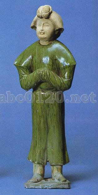 立俑。髪は髻鬟(まげ)に結っており,両びんと頭のうしろに張り,その末端は額の上に束ねている。袖の中の両手は胸の前でくんでいる。身には筒袖の緑色の襦衫をまとい,襟元は円く胸がはだけている。下半身は黄色の長い裙をつけ,えりの開いた藍色の外套を着ている。頭はかすかに右側をむき,靴先は上にそる。容姿は豊満で,唐代の貴族婦女の姿をあらわしている。出所:「シルクロード文物展」