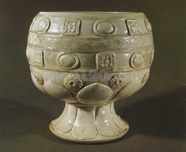 まるい碗で口はややつぼみ,底部にラッパ形の高い圏足がつく。胎は白く,白釉がほどこされている。口縁下には三筋の弦文があり、胴部は,四層にわかれ,型押しでつくった四角の金花と円形の宝石をまねた図案が胴部に貼られている。下腹部と高い圏足には蓮瓣が飾られる。下腹の蓮瓣のあいだには型押しの小円花があり,これは唐代の白磁のなかでも稀に見られるものである。乾封2年(667年)の段伯陽墓から出土したため,唐代における白磁生産の年代を研究するうえの重要な実物資料となっている。出所:「シルクロード文物展」