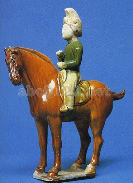 馬はこうべをまげ左を見,口を開き,尾をはねあげる。全体に黄褐釉がほどこされ,四足は方形底板のうえに立つ。馬にまたがる侍者は頭に加彩の籠冠をかぶり,身に緑色の円領で筒袖の長衣を着て,腰に帯をしめ,長靴をはいた足はあぶみを踏み,両手で手綱をもっている。出所:「シルクロード文物展」