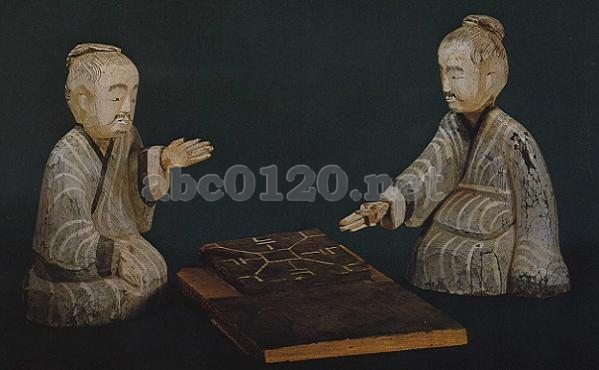 その特徴は,簡潔な表現手法を用い,精神の面,形式の面でも渾然とした効果をあげていることである。加彩木製猴はこの表現手法を用いた代表作品である。加彩木製一角獣はその角,四肢,およびぴんと立つ尾にいたるまですべて,力の充実を感じさせる。六博は頭を使って勝負する遊戯で,向かいあって坐る二人の人物には一角獣に用いられたような誇張した手法ではなく,素朴な手法を用い,その気分を表現している。出所:「シルクロード文物展」