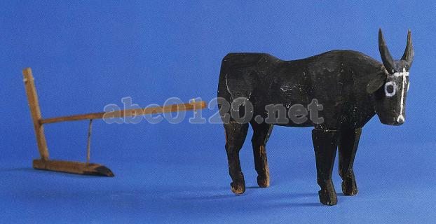 木の丸彫。牛の体全体に黒色がぬられ,白粉で目,鼻, くつわなどを描きだしている。造形は素朴で生きいきとしている。これは芸術品であるばかりでなく,漢代における耕犂の変遷を研究するうえで,かなりの価値をもつ。出所:「シルクロード文物展」