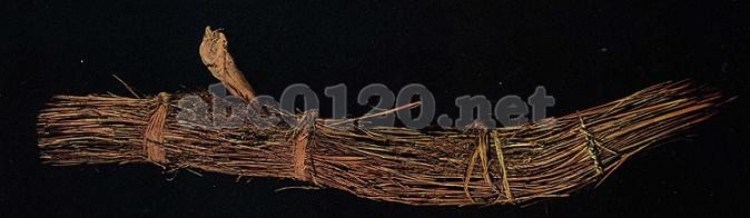 烽火をあげるために燃やす火苣(たいまつ)。これは蘆葦(あし)を草ひもでたばね,なかに短い棒切れがさしこまれている。完全なものは横に棒切れが三つさしこまれており,堡塁の上の籠のなかに固定して使用したものらしい。この火苣の上部は燃やした痕跡がある。出所:「シルクロード文物展」