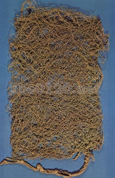 絹糸であんだ方形の目の網であり,ひもで網の周辺を通してつないでいるので,円形の投網であるかもしれない。ふちには網の鍾りの麻のひもがまだ残っている。同時に出土したものに網をあむのに用いる梭(ひ)があった。これらは辺境守備の兵士たちの用いた生産用具である。出所:「シルクロード文物展」