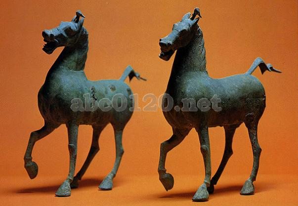 2世紀 青銅 高36.5cm,38cm 1969年武威雷台後漢墓出土 甘粛省博物館蔵 この2個の銅馬は,墓主に随従する者が乗るのに使う馬である。馬体は主人の馬よりやや小さいが,ほかの馬とは同じ大きさである。その姿は生きいきとして活潑である。その鋳造技法は銅奔馬と同じである。出所:「シルクロード文物展」