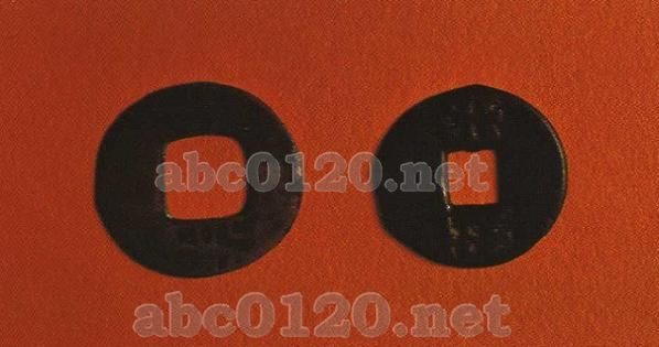 円形,方孔があく。 1面には篆書体で「半両」の2字がある。これは前漢前期に全国で流通した貨幣である。出所:「シルクロード文物展」