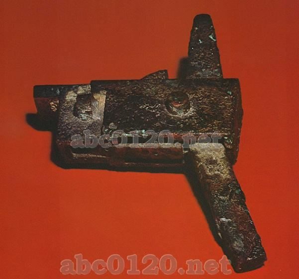 紀元前206~後24年 青銅 高17.7cm 長12cm 1959年若羌阿泣干出土 新疆維吾爾自治区博物館蔵 全体に緑銹におおわれる。弩機は完全で,部品は郭体,鈎牙,望山,懸刀,鍵などからなる。郭面には矢を射るため乗せる溝が刻まれている。これは前漢時代に全国で普遍的に使用されていた兵器の一種である。出所:「シルクロード文物展」
