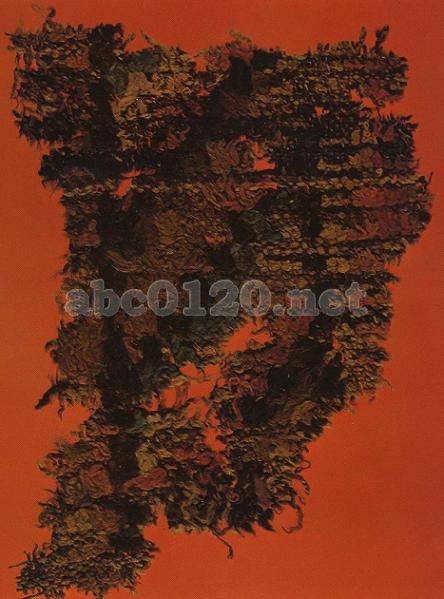 25~220年 毛 残長30cm 幅21cm 1959年民豊尼雅後漢墓出土 新疆維吾爾自治区博物館蔵 紅,黄,藍,褐色などの色の毛糸を用い,これらの毛糸を地緯糸にそって添毛し,文様をおり出している。これは中国西北部における少数民族の特産物である。出所:「シルクロード文物展」