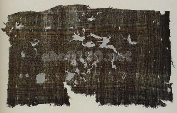 平織りで,組織は密である。 1平方センチごとに用いられた経糸は11本,緯糸は10本である。葛纈の技法で,藍地に白い文様のあるもの。その文様は円圏,円点,直線,三角などがあり,少数民族の特徴をあらわしたものである。出所:「シルクロード文物展」