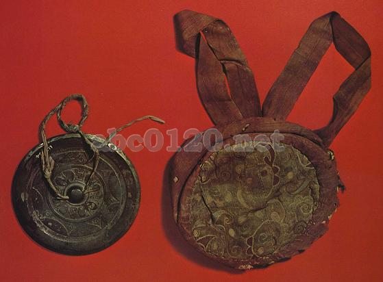 銅銃には円鈕,四葉座があり,座のなかには「君宜高官」の隷書の漢字がある。鈕には緑色の絹鈕がとおされている。鏡袋は香色方棋文の綾と赭色の絹を縫い合わせてつくったもの。鏡の袋は綾でつくられ,平絹は襠や紐につかわれている。鏡袋は赭,藍,黄,紫などの色の絹糸で唐草や円点の文様が刺繍されており,その刺繍はなめらかで生きいきしている。出所:「シルクロード文物展」