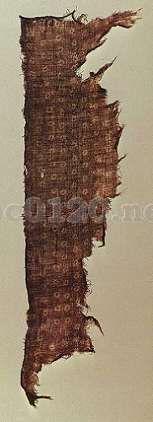 北朝 絹 残長32cm 幅8cm 1959年于田 屋于来克(ウユライク)出土 新彊維吾爾自治区博物館蔵 紅地に白文様がしぼりて染め出されており,はっきりとして,美しくおおらかなもの。出所:「シルクロード文物展」