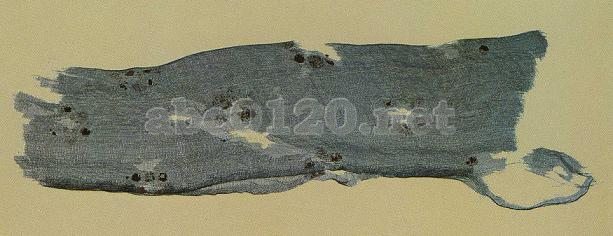 浅葱色(天青色)の紗に,紅,金,黄などによる小さな花ばなが散らされており,製作が精巧で地質は軽い。たしかに「これを挙れば無きがごとく,これを裁って衣となせば, まことに煙霧のごとし」といった感がする。出所:「シルクロード文物展」