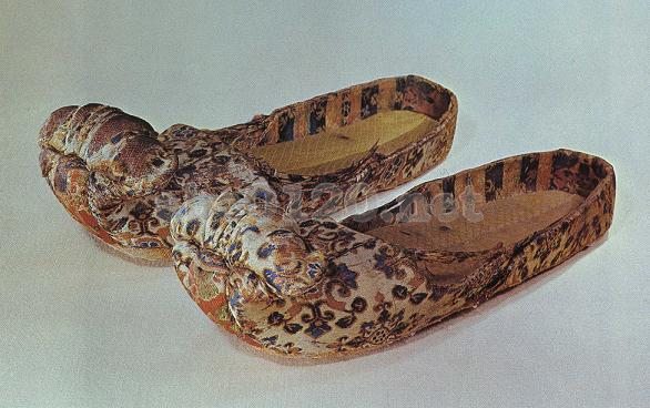 鞋(靴)の先は雲形,靴の両側には,靴ひもがつく。靴の表と内は綾地の経錦でつくられ,靴先は綾地の緯錦からなる。文様の図案は変体宝相花と縞文と花鳥と流雲などからなり,色彩があぎやかで華麗である。靴の底は綿布を縫いあげたもので,靴のなかには下敷があり,下敷のなかには綿がつまっている。下敷の上面は黄色の回文のついた綾でつくられている。これは貴族の婦人が生前にはいた靴で,貴重な錦織りを使っており,形の優美な点できわめてまれに見るものである。出所:「シルクロード文物展」