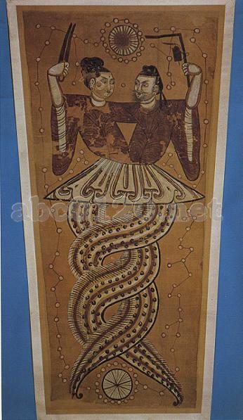 この画は,絹地のうえに赭,黒,白の三色を用い,上半身は抱擁し,尾部が交っている伏羲と女媧の姿を描きあげたものである。伏羲は,頭に幞頭(ずきん)をかぶり、顔にひげをたくわえ,襟の反った,広袖の衣を着て,手に曲尺と墨壺をもち,女媧は髪を高くゆい,おなじく襟の反った広袖の衣を着て,手にコンパスを持っている。 2人とも上半身は人間の体,下半身は蛇の形をしており,頭のうえに太陽,尾のしたに月,周囲に星座が描かれている。画の内容は,中国に伝わった神話伝説を故事を描いたもので,人物の形象と画の技法はあきらかに新疆地区の特色を帯びたものである。出所:「シルクロード文物展」