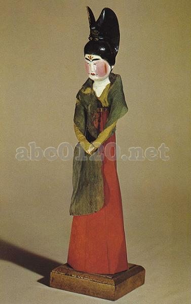 木の頭に木の体,腕は紙をよって作ったもの。頭に雲形のかつらをかぶり,額には紅で雉形の花鈿を描き,眉は黒く,