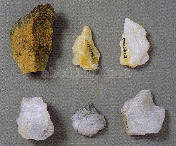 石英塊で作られている。一端の両側縁辺から片面へ二次加工され、歯突状に尖っている。 出所:「中国の考古学展-北京大学サックラー考古芸術博物館所蔵」